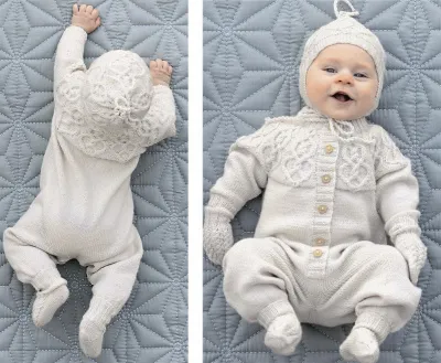 Пряжа Sandnes Garn Babyull Lanett (100% мериносовой шерсти; 175 м/50 г) кремового цвета (Putty № 1015) – 4 (5–5) 6 мотков для комбинезона, по 1 мотку для каждого размера шапочки, носков и митенок; круговые спицы № 2 и 2,5; чулочные спицы № 2 и 2,5; маркеры для разметки петель.