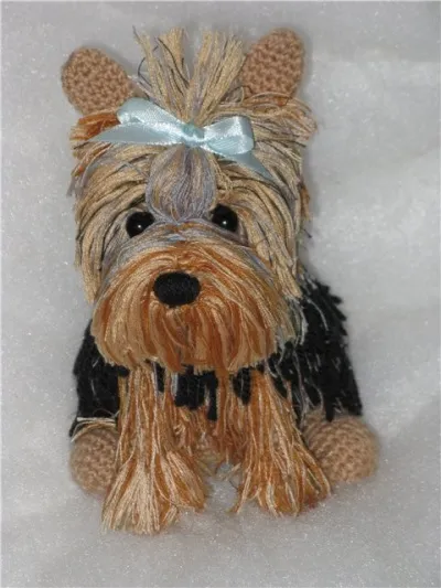 Вот такие детали получатся после того, как мы все связали. Теперь поплотнее набиваем все детали синтепоном, кроме ушек. Вот что должно получиться. Сшиваем голову с тельцем, пришиваем лапки задние и передние, хвостик, ушки и мордочку. Теперь необходимо вышить черными нитками носик и пришить глазки-бусинки. На следующем этапе мы будем наращивать шерстку. Для этого возьмем нитки мулине, вставим в иголку, вводим иглу с ниткой в каждую петельку, начиная с носика, протягиваем ниточку до нужной длины и завязываем узелок, лишнюю нитку обрезаем. Не забудьте, что потом мы будем подстригать нашу собачку, поэтому ничего страшного, если нитки получаются не идеально ровной длины.Неплохо поставить перед собой фотографию собачки, чтобы подбирать ниточки по цвету. Обычно мордочка у йорков рыжеватая. Поэтому берем немного рыжей и побольше бежевой нитки, примерно две ниточки светлые-одна рыжая. Дальше- на ваш вкус. Сначала собачка будет смешной, но потом, по мере наращивания шерстки, начнет обретать красоту. Пока она лохматая. Но мы ее подстрижем. Теперь уже можно попробовать чуть причесать собачку. Надеть ей заколочку. Чтобы определиться с цветом и расположением прядок. Для головки, наоборот, берем потолще серую ниточку, потоньше-светлую, головка у йорков сероватая. Спинка у некоторых, особенно щенков, черненькая, у взрослых собак-серая. Я сделала спинку черной. Лапки наращиваем рыжеватой ниточкой, добавляя чуть светлой. Теперь подстригаем нашу собачку, пользуясь фотографией настоящей собаки, причесываем тупым концом иголки. Наш чудесный малыш-йорк готов!