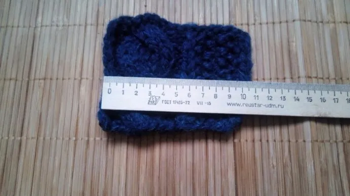 4. Далее я так же подсчитываю, сколько петель содержится также в 1 см и 5 см. Но уже не просто меряю линейкой образец, а немного растягиваю его, именно так, как будет носиться готовое изделие. Ведь шапочка все равно должна немного обтягивать голову. Свитер мы носим свободно, но небольшое натяжение нитей присутствует все равно, когда мы надеваем вещь на себя.