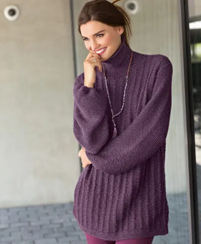 Вам потребуется: 850 (900) 1000 г пряжи цв. черной смородины «Almeria» (50% шерсти, 30% альпака, 20% шелка; 100 м/50 г) Austermann; спицы № 3,5 и 4,5; круговые спицы № 3,5; крючок № 3,5.