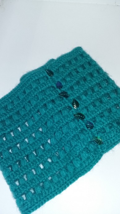 Снуд крючком узором "шишечки". Я бы хотела снуд косами, но заказчик захотела такой. Сказано-сделано. В оригинале должны быть пуговицы, я же использовала пайетки в виде листочка.