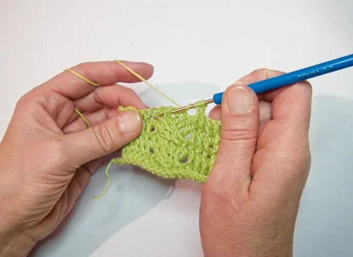 Сделать 3 накида на крючок, пропустить 3 ст. с/н предыдущего ряда и ввести крючок вокруг 4-го ст. с/н предыдущего ряда.