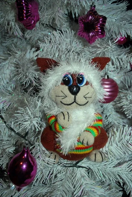 Новогодний котейка связан спицами, наполнитель для игрушек и подушек. Рост 18 - 20 см. Свяжу на заказ любого цвета. Мастер-класс - 100 рублей. сам котик - 850 рублей.