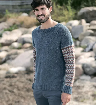 Пряжа (50% овечьей шерсти, 25% шерсти альпака, 25% вискозы; 50 г/ 110 м) – 8 (8) 9 (10) мотков цвета темной морской волны (основной цвет), 2 (2) 2 (2) мотка цвета светлой морской волны, 2 (2) 2 (2) мотка светло-серой, 2 (2) 2 (2) мотка кирпичного цвета; круговые спицы № 4,5 длиной 40 и 80 см; круговые спицы № 5 длиной 80 см; чулочные спицы № 4,5 и 5.