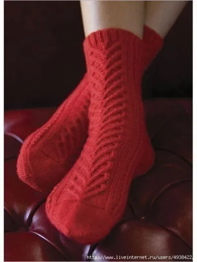 Последовательностью жгутов в форме сердечек. Густая плотность рисунков делает поверхность рельефной, а сами носки более теплыми.