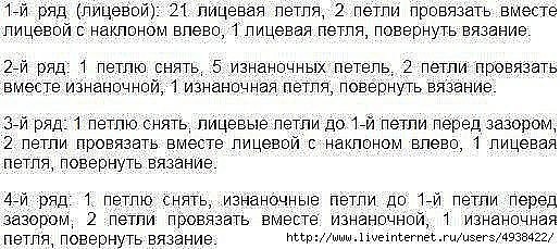 1-й круговой ряд: спица 1 – лицевые петли до 3-х последних петель на спице, 2 петли провязать вместе лицевой с наклоном вправо, 1 лицевая петля; спица 2 – продолжать вязать рисунок передней панели; спица 3 – 1 лицевая петля, 2 петли провязать вместе лицевой с наклоном влево, лицевые петли до конца ряда – убавлены 2 петли.