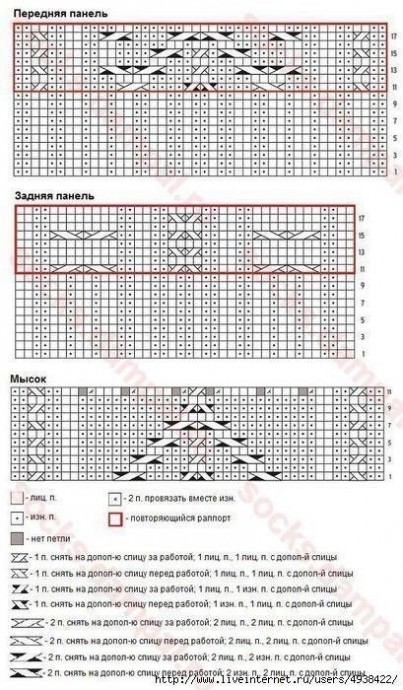 2-й круговой ряд: спица 1 – лицевые петли; спица 2 – продолжать вязать рисунок передней панели; спица 3 – лицевые петли.