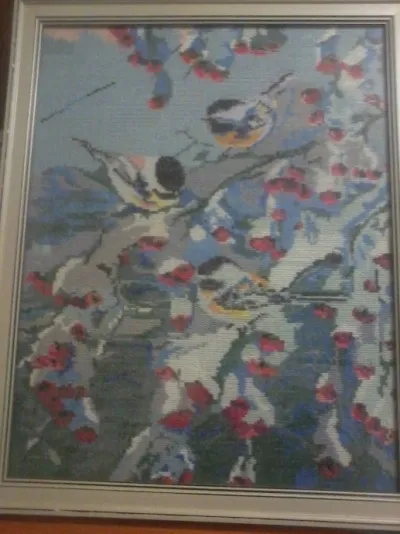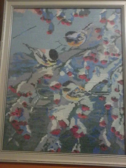 работ было много, дома немного, остальные нашли своих хозяев.Раздарила своим родственникам.Над этой работой пришлось посидеть.Вышивалась по белой канве со схемы, счетный крест