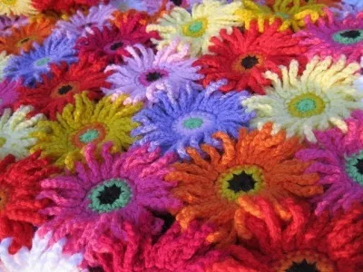 Гербера начинается с вязания серединки,так что лучше навязать их приблизительно нужное количество,а потом вязать цветы,соединяя между собой лепестками в одну ленту нужной длины пледа.Потом возвращаетесь назад ,цепляя лепестки цветов предыдущего ряда и новые
