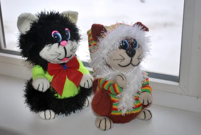 Праздничные котики связаны спицами. Устойчивы. Приятные на ощупь, мягкие.