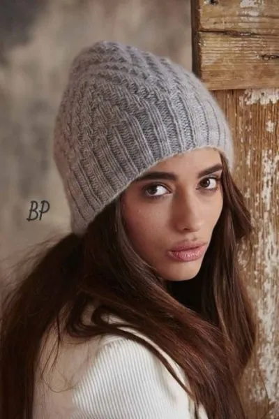 Шапочка вяжется круговыми спицами из кашемировой пряжи.