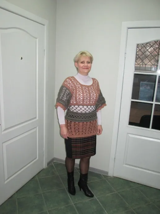Таня, уберите рукава совсем и серую вставку на талии… соедините верх с низом и тогда можно будет носить. А сейчас вы разбили свою фигурку на части и разным цветом и разными узорами…