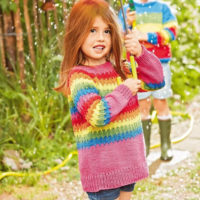 Яркий детский джемпер в свободном стиле связан разноцветной пряжей узором в полоску.