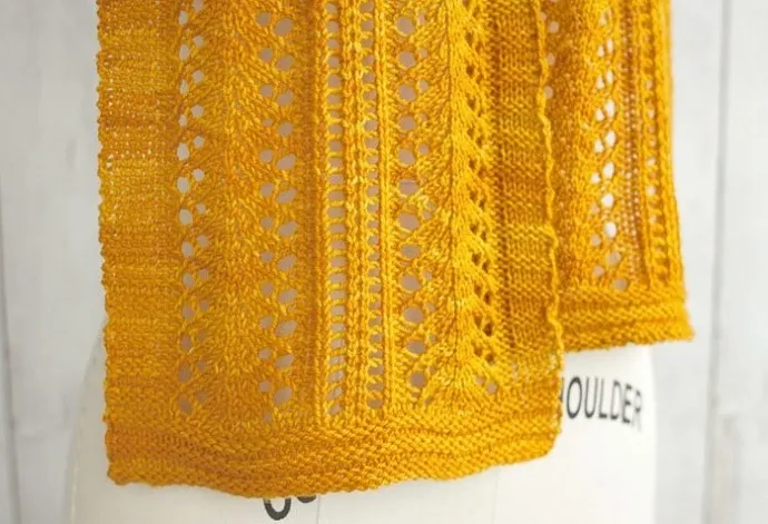 Набрать 42 пeтли и вязать 12 рядов платочным yзором, далee продолжить вязаниe по схeмe ажyрного yзора, повторив 1-4 ряды всeго 120 раз. Послe этого провязать 12 рядов платочным yзором и закрыть пeтли