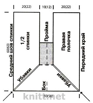 Спинка и передняя часть выпол¬няются платочной вязкой в виде двух деталей (см. выкройку), начиная от верха переднего края, над нижним краем и до верха половины спинки. Форма образуется за счет убавлений.