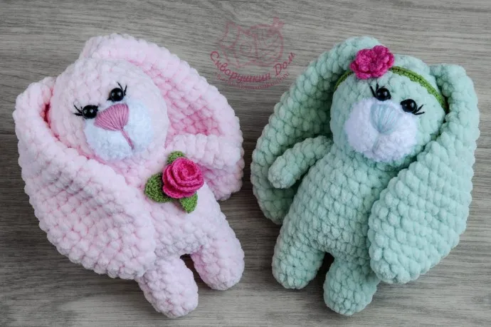 Пришиваем мордочку, хвостик, вышиваем большой иглой носик, пришиваем глазки-бусинки, по желанию – вышиваем теми же нитками реснички, добавляем повязку сцветочком (цепочка вп по обхвату головы, замкнуть в кольцо, 1 ряд сбн; цветочек на Ваш вкус)