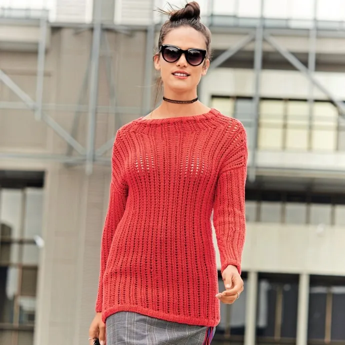 Пряжа (93% хлопка, 7% полиэстера; 105 м/50 г) — 550 (650) 750 г красной; спицы №5,5 и 6; короткие круговые спицы №5,5 и 6.
