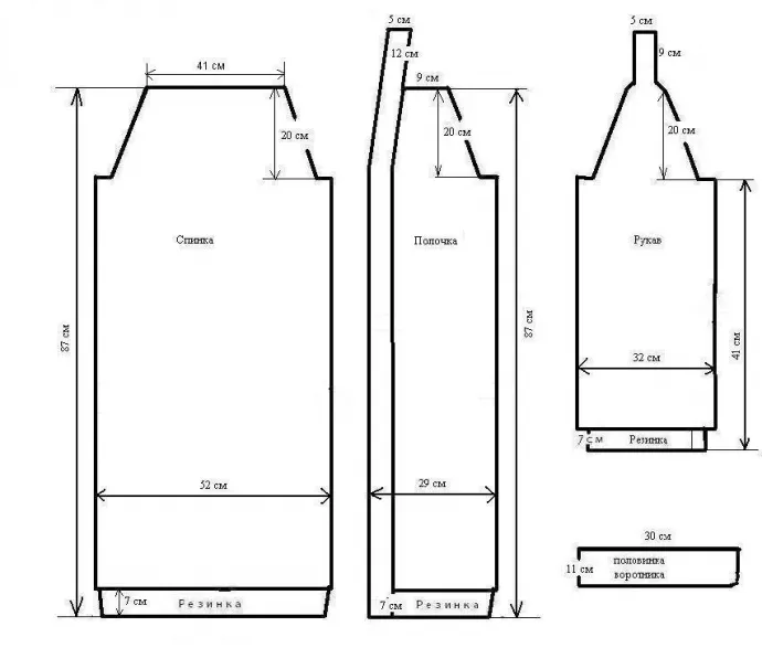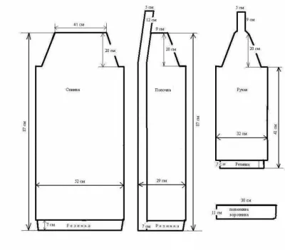 Провязав 33 узора «Зубчики» в высоту (67 см от наборного края), закрыть для проймы 1х6 п. с обеих сторон. Затем дважды через каждые 3 узора «Зубчиков» в высоту провязывать по 3 п. вместе с обеих сторон спинки (лиц. или изн. по узору) в начале ряда после кром.п., в конце ряда перед кром.п. Далее вязать без убавлений оставшиеся п. Через 11 узоров «Зубчики» в высоту (20 см) от начала скосов пройм закрыть все п., провязывая вместе поочередно по 2 п и по 3 п.