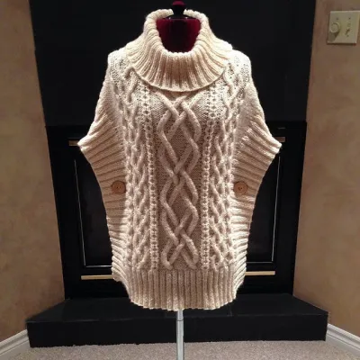 Рукава: на спицы №4,5 набрать 46 п. и вязать для края 4 п. двойной (полой) резинкой и 24 р. резинкой 2 х 2 = 9 см, равномерно прибавив 4 п. в последнем р. Перейти на спицы №5 и вязать следующим образом: 12 п. узором с косой В, 2 п. перекрестить направо, 22 п. узором с косой С, 2 п. перекрестить направо, 12 п. узора с косой В. На высоте 2 см = 6 р. от начала вязания прибавить с обеих сторон в каждом 8-м р. 9 раз по 1 п. и вязать прибавляемые следующим образом: 2 п. перекрестить направо, 7 п. изнаночной гладью. На высоте 38 см = 106 р. от начала вязания для оката закрыть с обеих сторон по 2 п., затем убавить на расстоянии 1 п. от края в каждом 2-м р. 22 раза по 1 п. На высоте 16 см = 46 р. от начала вязания закрыть оставшиеся 20 п.
