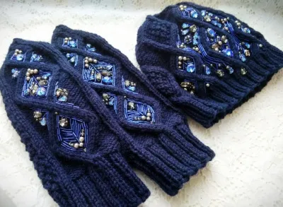 Комплект из шапки и варежек в тёмно - синем цвете с вышивкой стразами и бисером