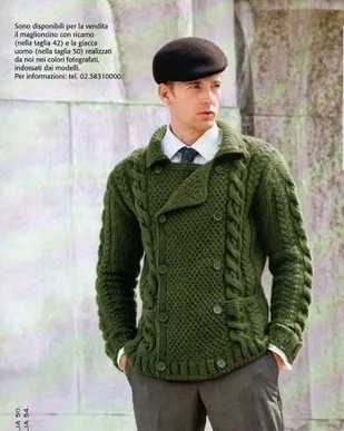 На высоте 49(51 .5) см для проймы рукава закрыть справа 3(4) п и продолжить вязать, закрывая в каждом 2-м ряду 2 п и 1 п. На общ высоте 60(64) п для формирования вертикального края вязать так: на первых 32(33) п продолжать вязать, как раньше, далее 20(21) лиц и затем поднять 89(94) п по вертикальному краю, во время поднятия петель сделать 5 отверстий для пуговиц, первое после первых 3 поднятых петель и остальные на расстоянии 19(20) п друг от друга, для каждого отверстия делать 1 накиднаправой спице и пропускать 1 п основы.