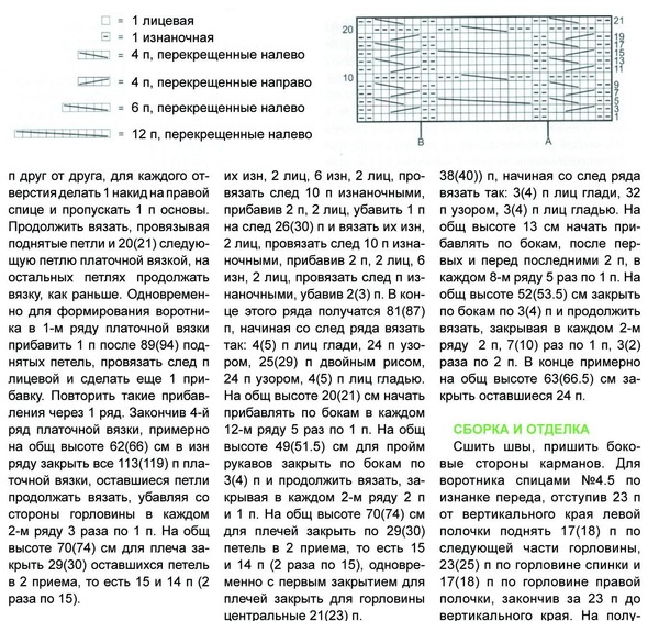 Фантазийным узор: по схеме, для левой полочки и правой половины спинки вязать петли после А, для рукава вязать всю схему. В четных рядах, не указанных на схеме, вязать петли, как смотрит вязка, кроме 10-го и 20-го рядов, о которых указано отдельно. Закончив 22-й ряд, повторять с 3-го. Для 4 п, перекрещенных направо, отложить 2 п за работу, 2 лиц, провязать лиц отложенные. Для 4 п, перекрещенных налево, отложить 2 п перед работой, 2 лиц, провязать лиц отложенные. Для 12 п, перекрещенных налево, отложить 6 п перед работой, 6 лиц, провязать лиц отложенные. Для 6 п, перекрещенных налево, изнаночными, отложить 3 п перед работой, 3 изн, провязать изн. отложенные.