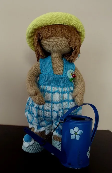 Кукла связана из акрила, наполнение - холлофайбер, также для жесткости имеется проволочный каркас. Комбинезон связан спицами, шляпка и обувка - крючком. Высота куколки - 30см. Леечку сделал муж, за что ему большое спасибо