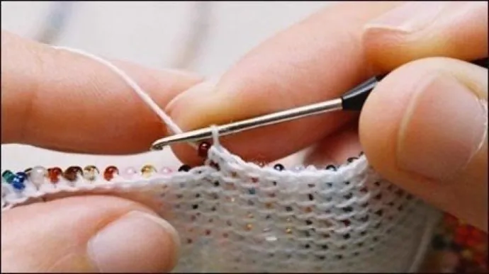 Фото 1: На фото показано положение рук при вязании – небольшое количество бисера указательным пальцем левой руки придвигаем к полотну, одновременно средним пальцем правой руки придерживаем петлю на крючке, предохраняя ее от растяжения.