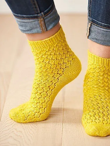 Ажурные носочки от дизайнера Clare Devine выполнены из пряжи солнечного оттенка, они имеют французский мысок и пятку, сформированную укороченными рядами. Все вместе напоминает спелый ананас и выглядит весьма жизнерадостно.