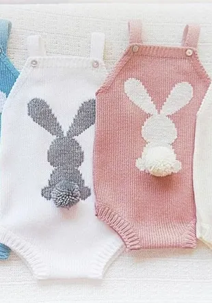 Схемы милых зайчиков, для вязания детских изделий. Зайчики с круглыми пушистыми хвостиками расположились на летнем комбинезоне без рукавов для самых маленьких. Хвостики зайцев выполнены в технике изготовления обычных помпонов. На Вы можете не перегружать изделие лишними деталями, оставив зайцев без их очаровательных круглых хвостиков. На комбинезонах зайцы повернулись к нам спиной, большие уши победно возвышаются на голове зайцев. В статье Вы можете найти две схемы для вязания или вышивки зайцев.
