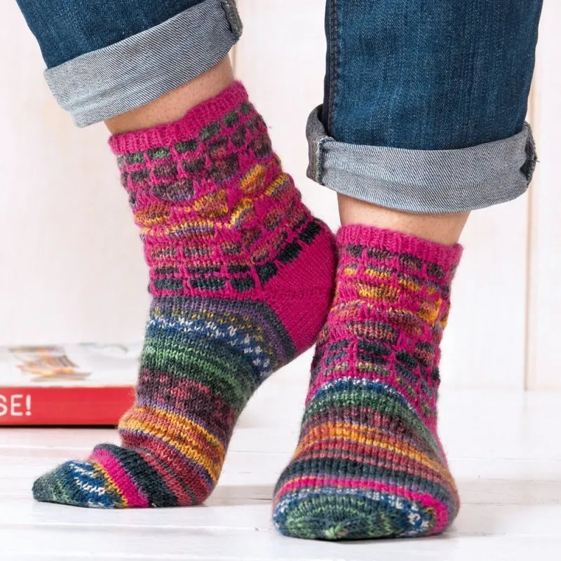 Пряжа в 4 сложения (75% шерсти, 25% полиамида, 425 м/100 г) — по 100 г разноцветной секционного крашения и ярко-розовой; комплект чулочных спиц №2,5.
