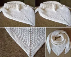 Этот узор имеет свойство стягивать полотно, поэтому со спиц шаль будет больше напоминать корявенький ромб, шаль необходимо хорошенько увлажнить и растянуть.