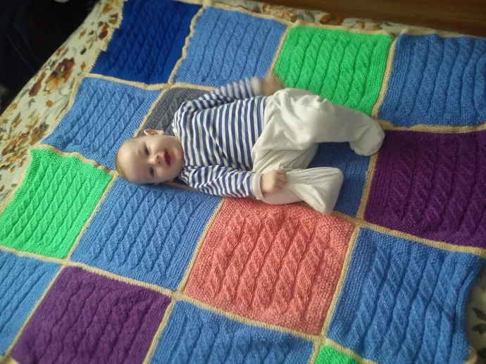 Давно это было. Лет 5 назад вязала, когда ждала рождения своего среднего сыночка. Потом укрывала доченьку. Связала из остатков ниток.