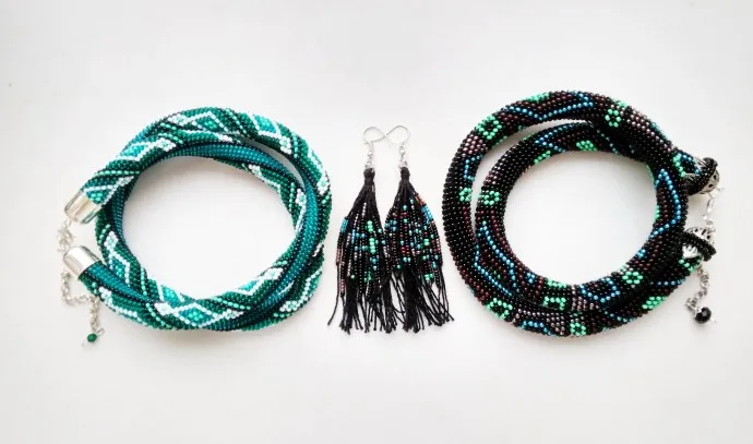 2.Колье - жгут из бисера с орнаментом. Колье с красивым геометрическим рисунком -орнаментом выполнено на заказ в технике "вязаный бисерный жгут". В работе использован качественный чешский бисер и фурнитура под серебро, концевики ажурные обшиты бисером. Серьги из нитей и бисера выполнила в подарок заказчице, чтобы можно было носить комплектом), длина колье вместе с застёжкой около 55 см, плюс имеет небольшую цепочку -удлинитель.