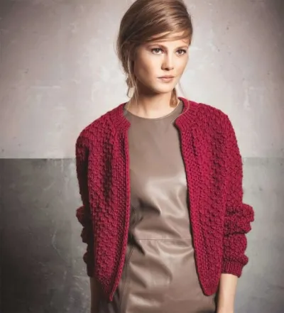 Плотность вязания: 16,5 п. и 20 р. = 10 x 10 см — жемчужным и узелковым структурным узором, спицы №6.