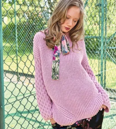 Интересное сочетание узора из сот с полупатентной резинкой и эффектное оформление низа изделия делают этот джемпер очень стильным.