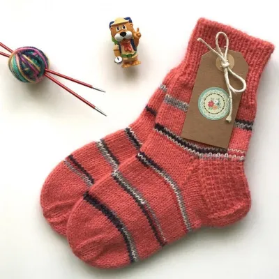 Носки связаны из итальянской бобинной пряжи Lanificiodellolivo ( кидмохер + бэбиальпака), а полоски нитками Novita nalle taika . Пятка укреплённая , двойная.