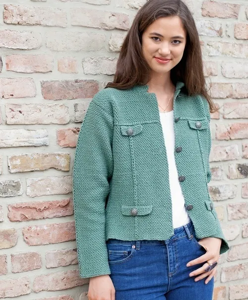 Пряжа (60% натуральной шерсти, 40% полиакрила; 120 м/50 г) — 900 (950) 1000 г зеленой; крючок № 3,5; 9 пуговиц (диаметр 23 мм) цв. старого серебра.