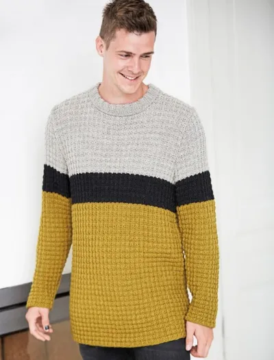 ВАМ ПОТРЕБУЕТСЯ: Пряжа (65% шерсти альпака, 35% шерсти; 50 г/100 м) — 4 (5) 5 (6) мотков серой меланжевой, 2 (2) 2 (3) мотка черной, 8 (8) 9 (9) мотков желтой, цвета охры; прямые спицы №4,5 и 5, круговые спицы №4 длиной 40 см.