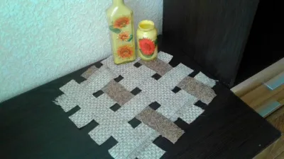 Салфетку - плетенку из остатков дерюжки я сделала за 15 мин. Остаток ткани, можно 2-х видов,разрезать на одинаковые полоски. Затем соединить строчкой или клеем,и современная салфетка готова. Такая салфетка украсит ваше жилье, придаст ему современный вид и будет радовать глаз...