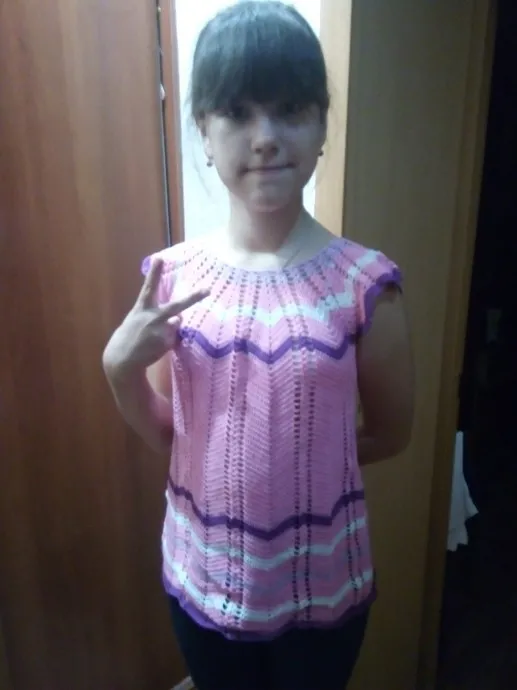 Эта маечка связана из остатков пряжи. Розовые - ирис, остальные - сосо, крючок 2.