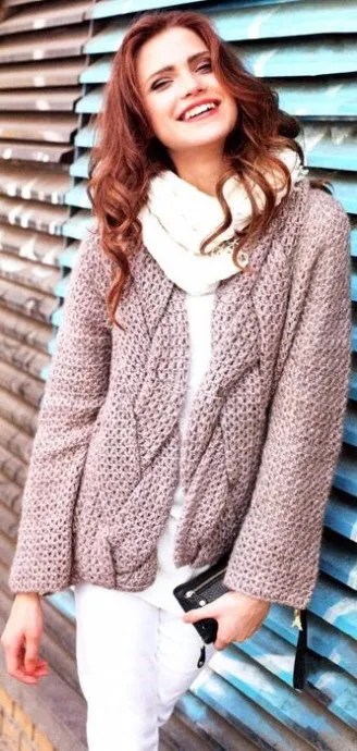 Сначала продолжить вязать левую полочку и через 40 см = 30 р. от разделения закончить работу. Остальные детали закончить так же, при этом продолжить прибавления на середине спинки = 39 групп ст. с/н + 2 крайних ст. с/н для спинки. Выполнить боковые швы и швы рукавов. Для плетёной планки выполнить 3 полых шнура. Для этого связать цепочки из 30 возд. п. и сомкнуть в кольцо 1 соед. ст. Затем вязать основным узором круговыми рядами.