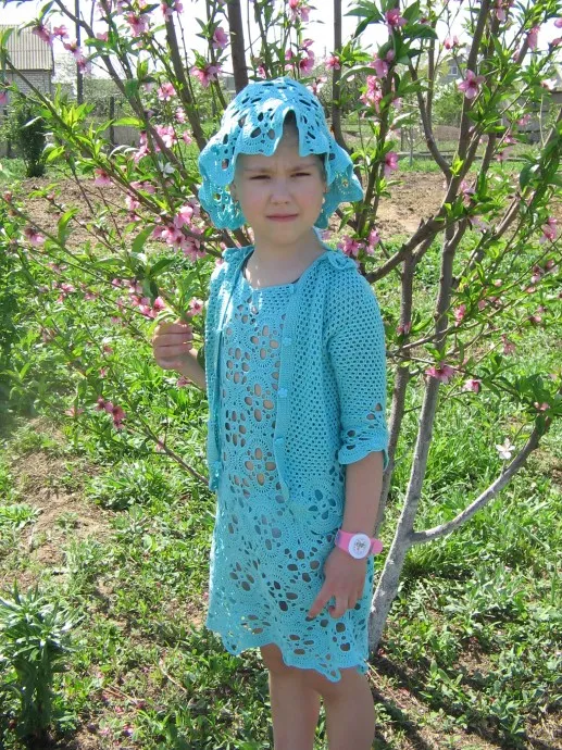 Этот комплект я связала крючком, нитки сосо. Сарафан связан из мотивов. Шапочка тоже. У кофточки мотивы по низу переда и спинки и на рукавах.