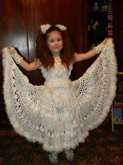 В 2009 году, когда моей племяннице Тане было 3 года, я связала для нее это платье для Новогоднего утренника в садик. Платье связано из ниток YarnArt Summer, обвязка и пояс из "травки", крючок №3. В комплект входят платье, сумочка, пояс, митенки, ожерелье и резиночки.