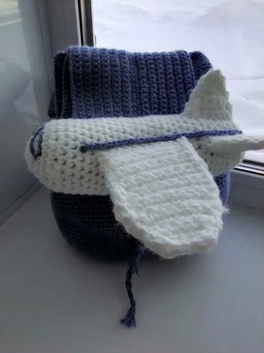 Спасибо! Идеи из интернета. Первый рюкзак был розовый «Китти», а потом подумала, что надо связать и внуку, ему 7 лет. Хотела сначала с мордочкой волка из " Ну.погоди" связать. Это его любимый мультгерой. А потом решила, что это несерьезно, и связала самолет.