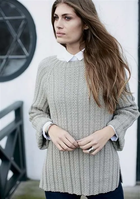 Пряжа (53% хлопка, 33% вискозы, 14% льна; 50 г/110 м) — 15 (16) 17 мотков серо-бежевой; спицы №3,5; круговые спицы №3,5 длиной 60 и 80 см; круговые спицы №3 длиной 40 см; крючок №2.
