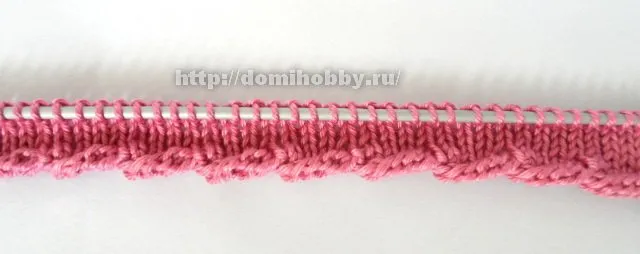 В 5-ом лицевом ряду формируется скрученный край. Для этого после провязывания каждых 4-х петель лицевыми перекручивайте левую сторону вязания по направлению к себе.