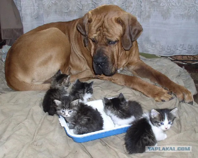 А Боня принял его малышом. Заменил ему маму. Буся и сейчас спит на нём, греется.