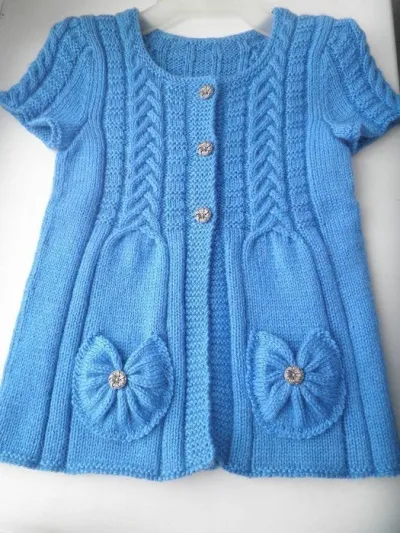 Пришить 1 пуговицу в центре каждого кармана. Пришить карманы на каждую половину переда за 2 см от низа, распределяя на 12 п. лиц. глади.