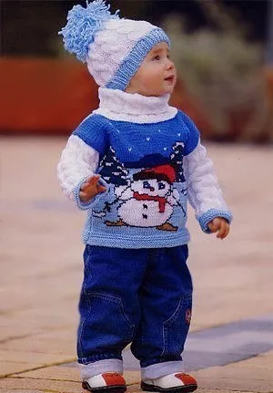 Нитью светло-голубого цвета набрать 83 п. и вязать 3 см резинкой 1х1. Затем выполнить узор по схеме 1: 2 р. нитью светло-голубого цвета и далее нитью белого цвета. На высоте 17 см убавить на п. каждой «косы» по 2 п., а между «косами» - по 1 п. Вязать 2 р. ровно, после чего провязать каждые 2 соединение п. вместе лиц. Через оставшиеся п. протянуть нить и стянуть ее. Выполнить шов. На макушку шапочки пришить помпон светло-голубого цвета диаметром 13 см.